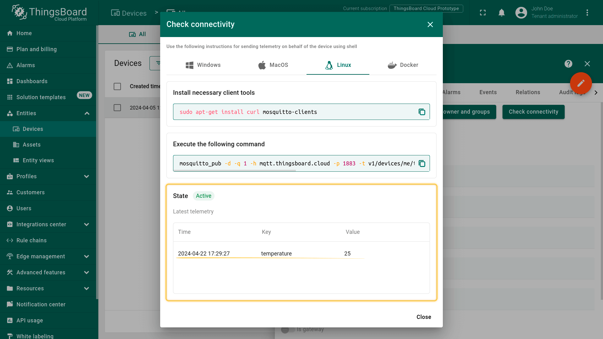 In ThingsBoard, there’s a convenient feature called “Check Connectivity” that automatically generates a command based on your host and the device credentials you provided. All you have to do is copy and run it.