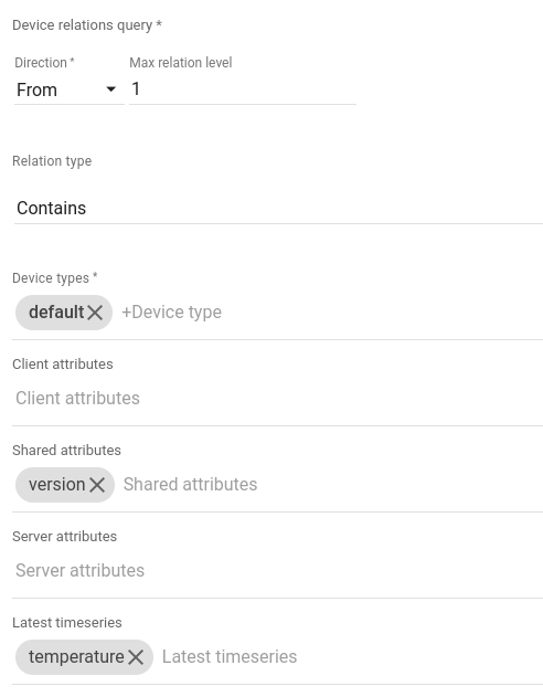 In ‘Device relations query’ configuration Administrator can select required Direction and relation depth level. Also Relation type can be configured with required set of Device types.