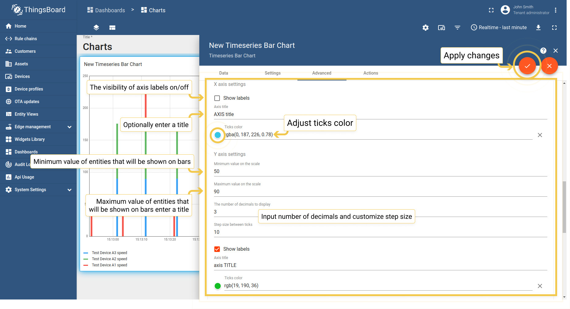 Basic widget settings are responsible for the appearance and style of the widget: from the title style and legend configuration to the settings for mobile devices. All of ThingsBoard widgets have the same basic settings, you can learn how to customize them here.