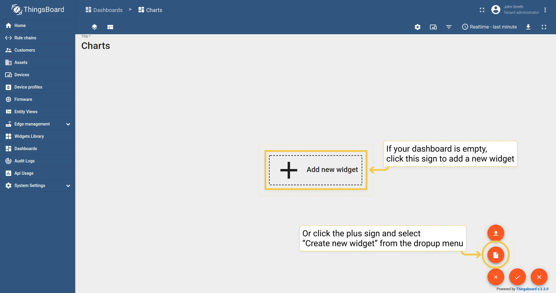 - To add a widget, either click the sign "Add new widget" in the center of the screen or open the drop up menu by clicking the plus icon and selecting "Create new widget".