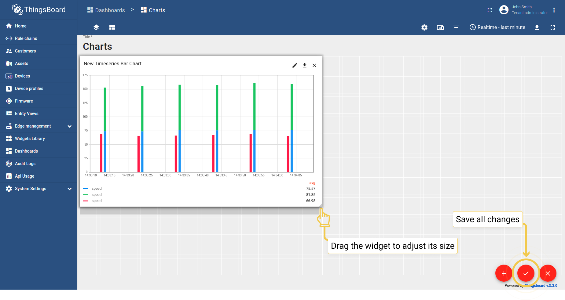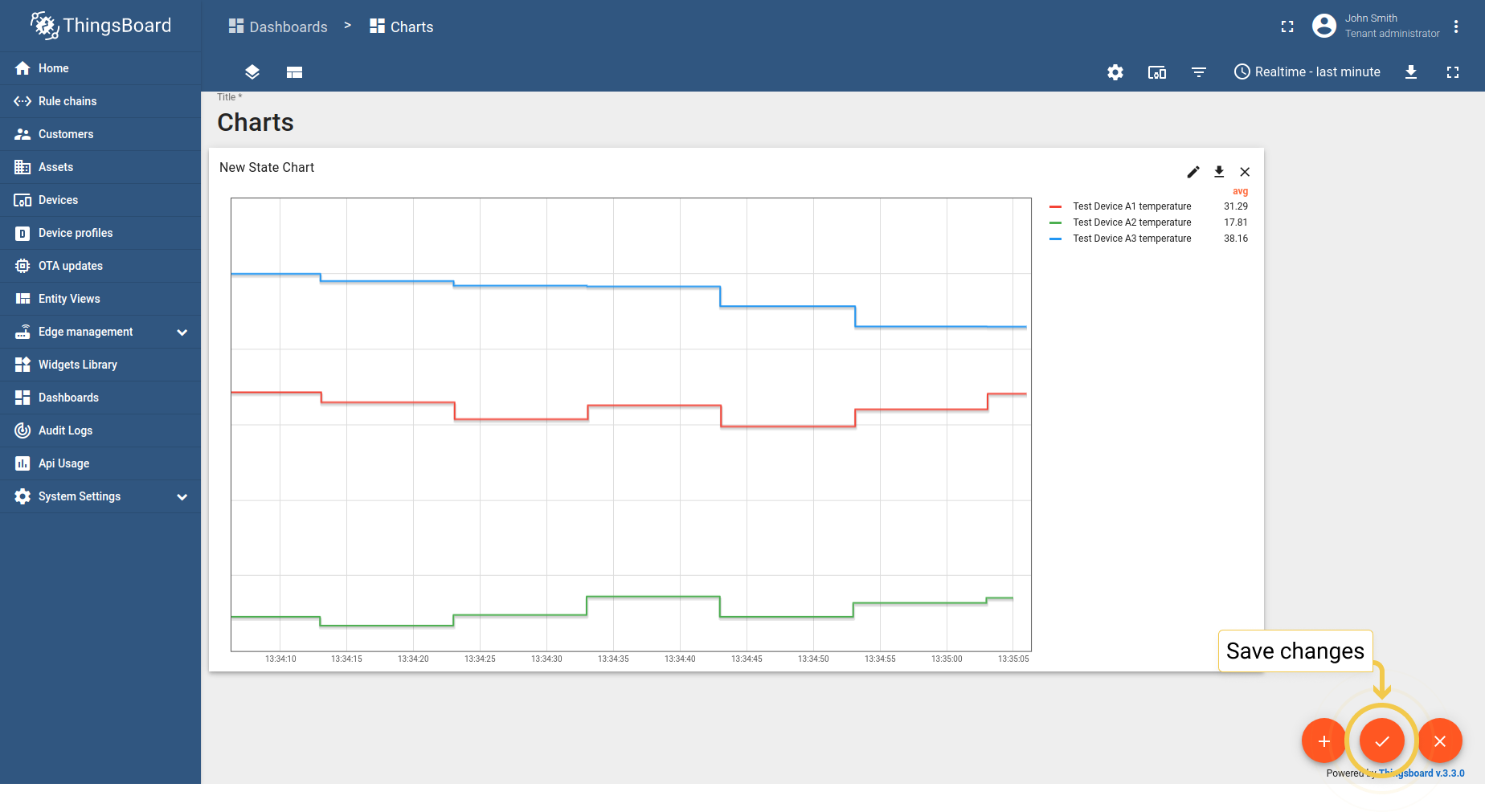 Chart widgets are divided into Timeseries and Latest value widgets. Timeseries widgets are useful for visualizing changes in time series data over time. Latest values widgets are used when you need to see the latest attribute values or time series data for multiple entities.