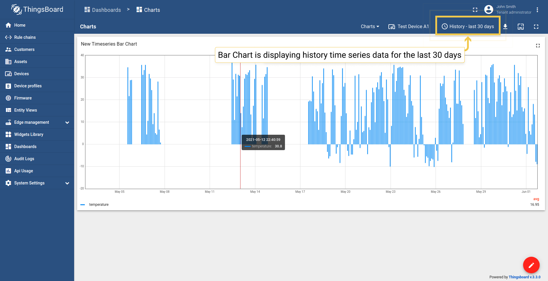 Bar Chart widget displays changes to time series data over time. The example shows the temperature readings.