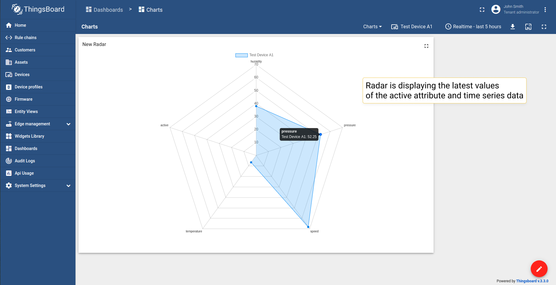 Radar widget displays the latest attribute or time series data values for multiple entities in a radar chart. Supports numeric values only.